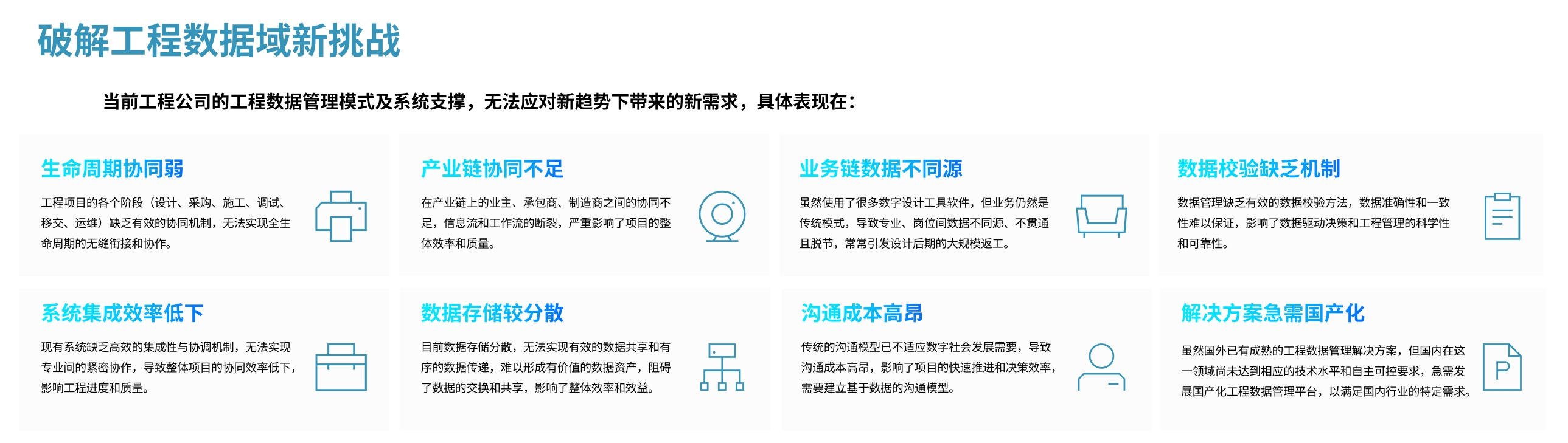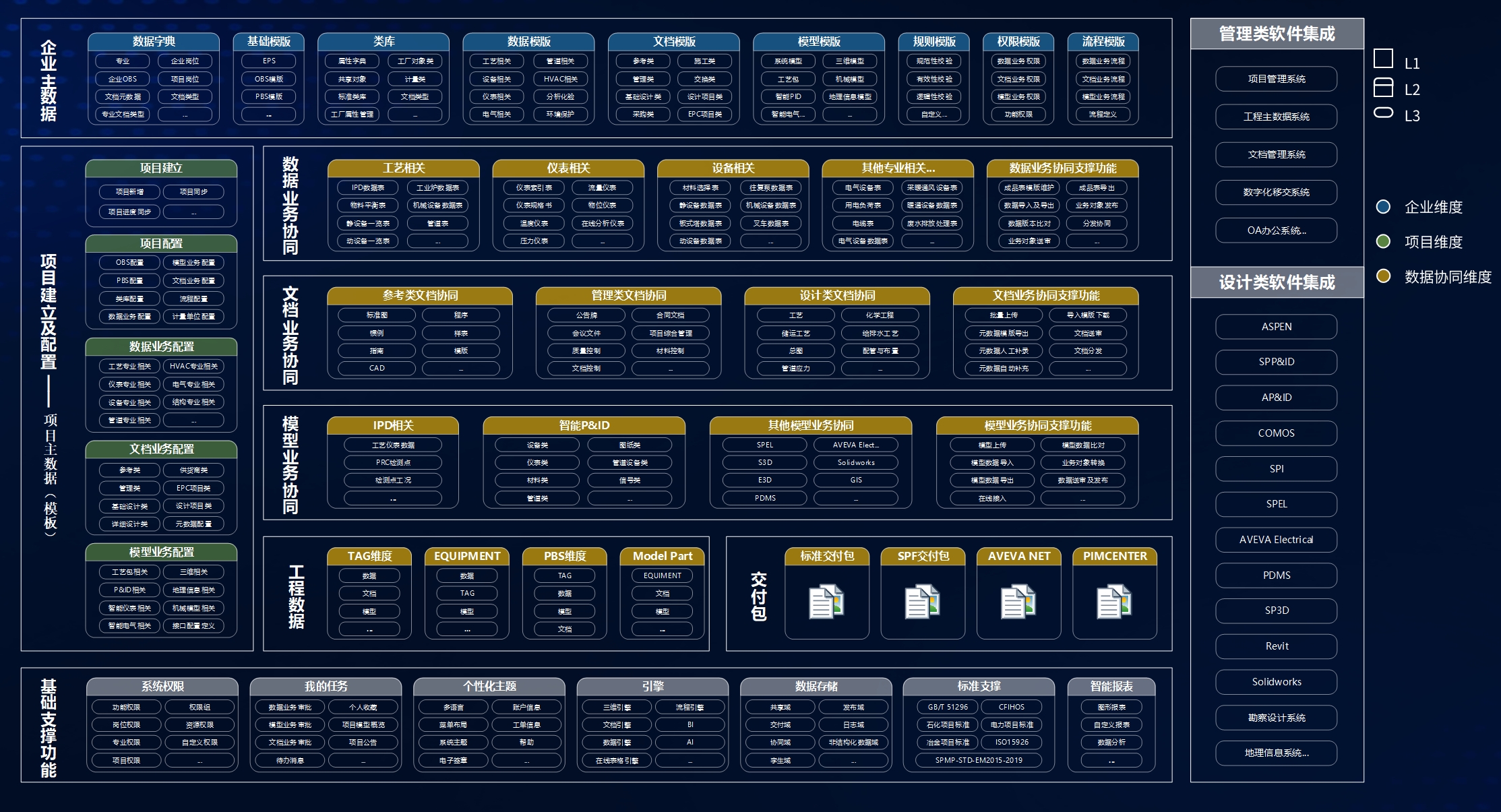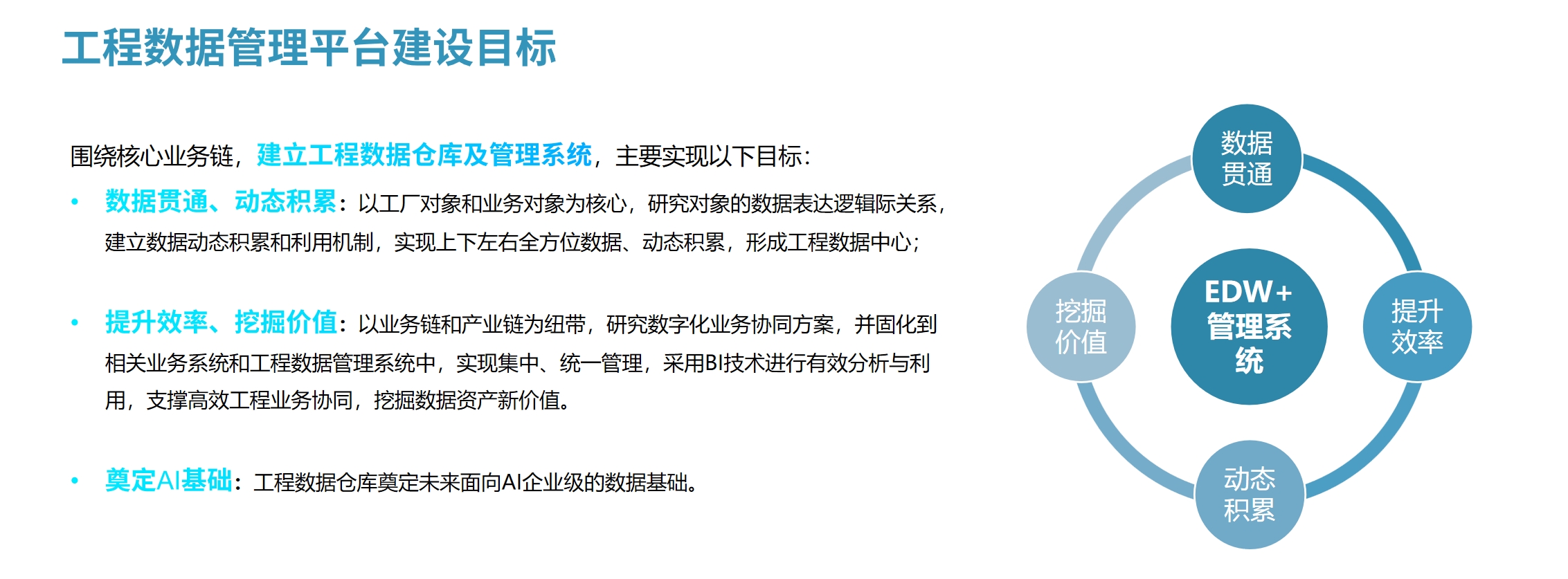 围绕核心业务链,建立工程数据仓库及管理系统,实现集中、统一管理,备承载数据积累和利用机制的、业务链和产业链协同工作的、发挥数据资产价值的业务协同和数据管理平台。
