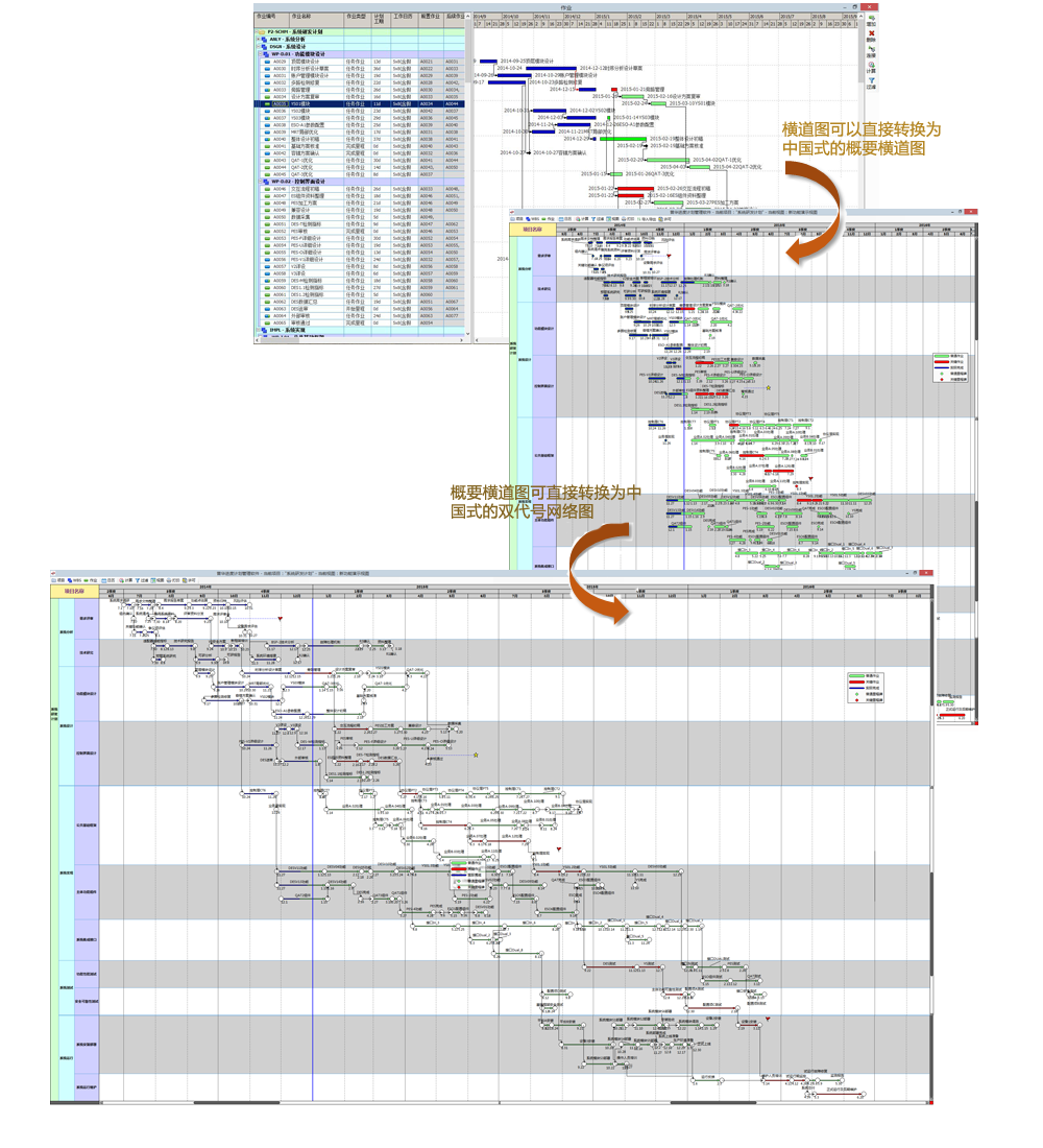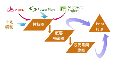 "概要横道图"、"时标横道图"和"时标双代号网络图"等。然而,不无遗憾的是,现在使用较多的计划管理软件都无法满足这些将CPM网络计划技术与中国式计划编制和展示方式相结合的基本需求。